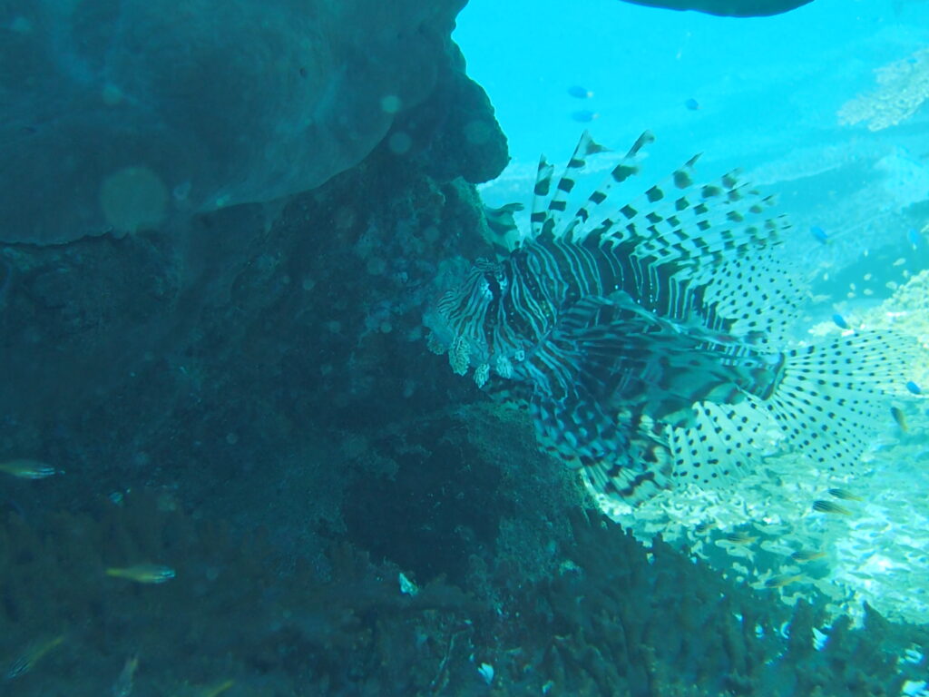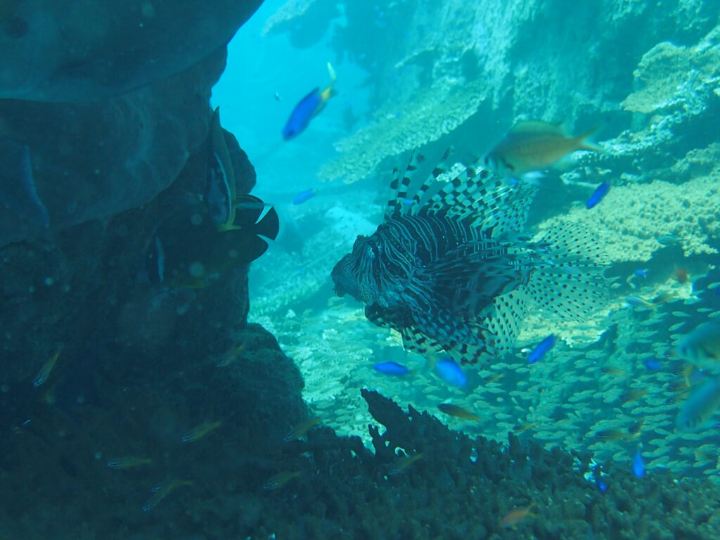 • ちょっと小太りのハナミノカサゴさんが岩陰でのんびり泳いでいます・・・身体の大きさからしてまだまだ成長した大人とは言えない大きさですが太さと模様は立派なハナミノカサゴさんです・・・周りに小さなお魚さんがたくさんいますので餌には困らないのか?すでにお腹いっぱいに食べたのか?昼間だからボーっとしているのか?わかりませんが食事に関してあまり興味が湧いていないようです・・・でも眼ではしっかり小魚さん達を確認している様なので暗くなったらどいつを食べてやろうかとちゃっかり品定めをしているのかもしれません・・・ところでハナミノカサゴさんもミノカサゴさんも夜行性で昼間は岩陰に隠れて泳ぐときは鰭をゆっくり動かして漂っていて外見上よく似ています・・・ぱっと見区別しづらいかもしれませんが両者を見分けるためのポイントがいくつかあります。