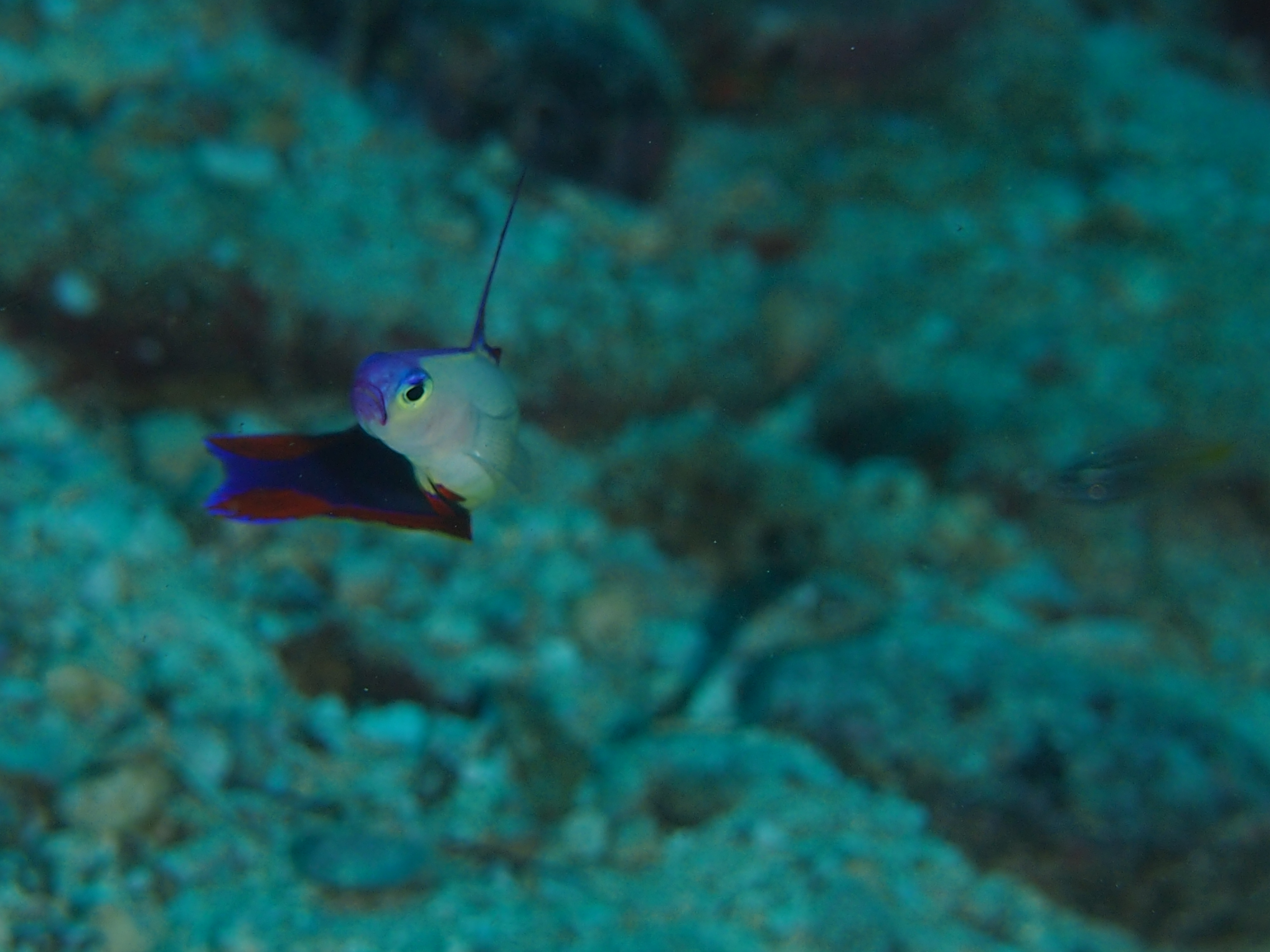 • 何か引っかかる事でもあったのか急に体をひねって後ろを確認しているアケボノハゼさんですが背鰭がまるで危険を察知するアンテナのようにピンと張っています・・・もちろん背鰭にそんな機能はありませんがどちらかというとハタタテハゼさんより背鰭は短いはずなのに随分長く見えますね?・・・ハタタテハゼさんより気性はやや強めのアケボノハゼさんですが表情にその気配を感じてしまいます・・・ちなみに深場が大好きで個体数も少ない同属のシコンハタタテハゼさんは体全体のパープルがとても美しく和名にも紫紺という名前が付いています・・・シコンハタタテハゼさんの頭部は黄色で体は濃い紫色という非常に美しい配色になっておりハタタテハゼ属の最上位のレアキャラなのです・・・シコンハタタテハゼさんの英名はヘルフリッチ・ダートフィッシュさんと言いますがヘルフリッチはこのシコンハタタテハゼさんの魚の標本採集に貢献した海洋生物学者への献名でダートは矢のように動く魚を意味しています。
