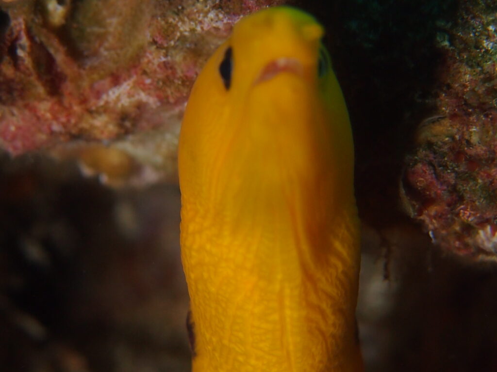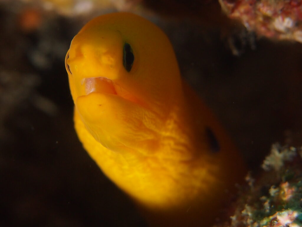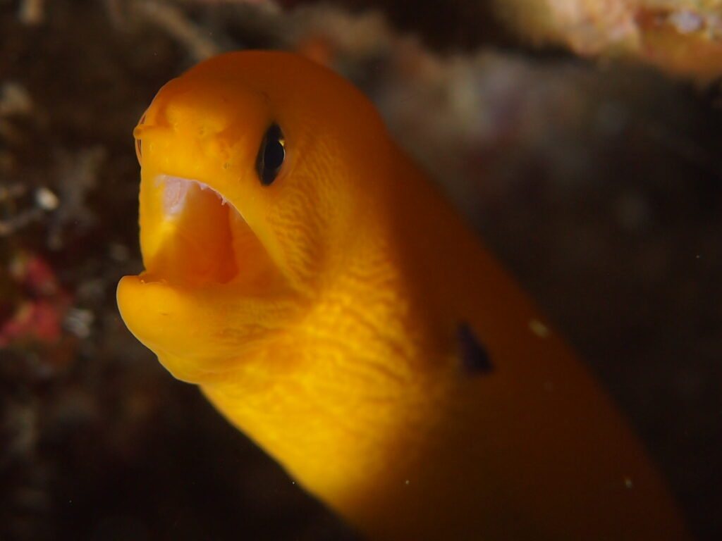 口を開けて威嚇?小さな牙!あくびにしか見えない?猫目の可愛い黄色いヒメウツボさん! 柏島 ウツボ diving-photo-summary-tsubuankun