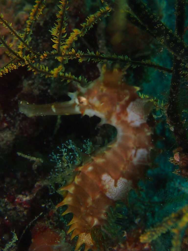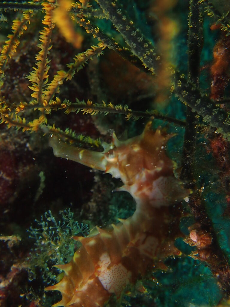 • ちょっと折角の特徴的な顔がピンボケになってしまいましたが身体のトゲトゲが目立つヨウジウオ目ヨウジウオ科タツノオトシゴ属のイバラタツさんではないでしょうか?・・・イバラタツさんは水深15m~40mの砂底や岩礁域のソフトコーラルやカイメンや藻類などが生える所で暮らしています・・・イバラタツさんの色や形は藻などに似せて擬態をしていて黄色や茶色や赤色それから緑色など多様でありますが確かにこのイバラタツさんも周りの藻類に色がよく似ています・・・茶色だけでなくちょっとぼつぼつした模様の入った白い斑点なんかはなかなかの拘り様です・・・イバラタツさんは頭の上にある頂冠は低く体に多数の鋭い棘がありますので他のタツノオトシゴさんとは容易に区別ができます・・・このイバラタツさんは腹部に育児嚢が無いようですのでメスのイバラタツさんでしょうか?・・・イバラタツさんは肉食性で動物性プランクトンやアミやエビそれから小魚などを細い口で吸い込むように捕食しますがこのイバラタツさんも何か獲物を狙っているようです。