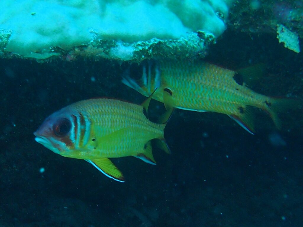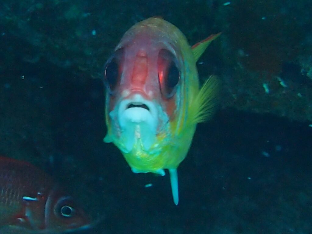 - 岩陰に隠れていたのはイットウダイさんの仲間の様ですが身体の色がちょっと黄色いのでキンメダイ目イットウダイ科イットウダイ属のスミツキカノコさんでしょうか?・・・スミツキカノコさんの頬には3本の白い線があり顔はやや赤く背鰭や臀鰭そして尾柄中央に黒色斑があるのが特徴です・・・またスミツキカノコさんは上顎が下顎よりもやや前方に突き出ていますが私の印象では下顎の方が付き出しているお魚さんの方が多い様な気がしますのでこのスミツキカノコさんの表情は意外です・・・それから丸っこいアカマツカサ属と比べてとんがったイットウダイ属のなかでも特にとんがった姿をしたスミツキカノコですが各鰭の棘は強大で他のイットウダイ属と同様にとりわけ臀鰭第2棘が太くなっています・・・下の写真のスミツキカノコさんは正面を向いて「あなたは誰?なんでこんな所に居るの?あっちに行ってよ!」と言っているようですがその後ろでとぼけた表情の横顔はアヤメエビスさんでしょうか?・・・ちょっと可愛い!!