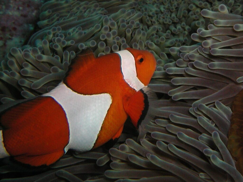 • イソギンチャクの隠れ家でノホホーンとのんびりしているのはカクレクマノミさんですがお腹がパンパンです!・・・もうじき可愛い赤ちゃん(卵)が生まれそうですがちょっとお疲れ気味の様でカクレクマノミのお母さんの表情が眠そうです・・・赤ちゃんを産むのは大変なことですから眠いのも仕方ないですよね・・・心穏やかにお過ごしください・・・ちなみにカクレクマノミさんの性別ですが群れの中で身体が大きいか小さいかで見分けがつきます・・・一番大きいカクレクマノミさんがメスで仲良さげに一緒に泳いでいる次に大きいカクレクマノミさんがオスでその2匹が夫婦の関係となります・・・大きいメスはイソギンチャクの中で堂々とした動きを見せオスはその周囲でメスを守るような振る舞いをすることが多い様です・・・つまり一番大きいカクレクマノミさんがメスで二番目に大きいカクレクマノミさんがオスそして3番目4番目のカクレクマノミさんがオスでもメスでもないカクレクマノミさんなのです・・・この未成熟のカクレクマノミさんは群れの端にいて控えめに行動しあまり目立たないのも特徴です・・・しかも不測事態が起こってメスがお亡くなりになると2番目に大きいオスがメスになり次にオスでもメスでも無い3番目の大きさのカクレクマノミさんがオスに変わっていきます・・・すぐに変化するわけではないのですが不測の事態状況下になると時間をかけ変化はおきていくのです・・・この写真では写ってないですけど近くできっと旦那さんが暖かく見守ってますよね!
