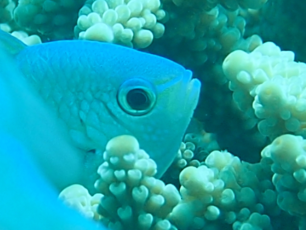 • デバスズメダイさんは自分によく似たアオバスズメダイさんと混生していることがありますがアオバスズメダイさんの胸鰭の基部は黒くなっているのでデバスズメダイさんと区別することができます・・・デバスズメダイさんはおとなしい性格で群れを成して暮らしていますが危険を察知するとあっと言う間にサンゴの隙間に隠れてしまいます・・・上の写真の様にサンゴの上空をのんびりと泳いでいたデバスズメダイさん達も一斉にサンゴの隙間に隠れてしまうのです・・・その動きはザっという音が聞こえてくるような見事な動きです・・・下の写真のデバスズメダイさんは「誰だよ!驚かせたのは?びっくりして急いで隠れたらサンゴに頭をぶつけちゃたじゃないか!」って文句を言っているようです。