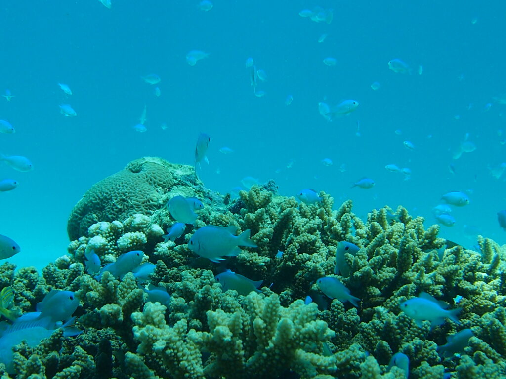• ケラマの綺麗なサンゴ礁で気持ちよさそうにサンゴに隠れたりちょっと離れたりで仲間と仲良く泳いでいるのはスズキ目スズメダイ科スズメダイ属のデバスズメダイさんではないでしょうか?・・・ちなみにデバスズメダイさんの和名は下顎の歯が突出していることに由来しているそうですが私的にはそんなに出歯だとは思えないのですが如何でしょうか?・・・デバスズメダイさんは全長5~8cmほどの小型種で体色はほぼ一様に青味がかかった緑色ですが頬部と腹面は緑がかった銀色をしています・・・またデバスズメダイさんは光の当たり方によって様々な種類の青色が映る綺麗な身体をしていますのでこの様に太陽の光が燦燦と届く浅場のサンゴ礁ではその力を遺憾なく発揮して見事な乱舞を見せてくれます。