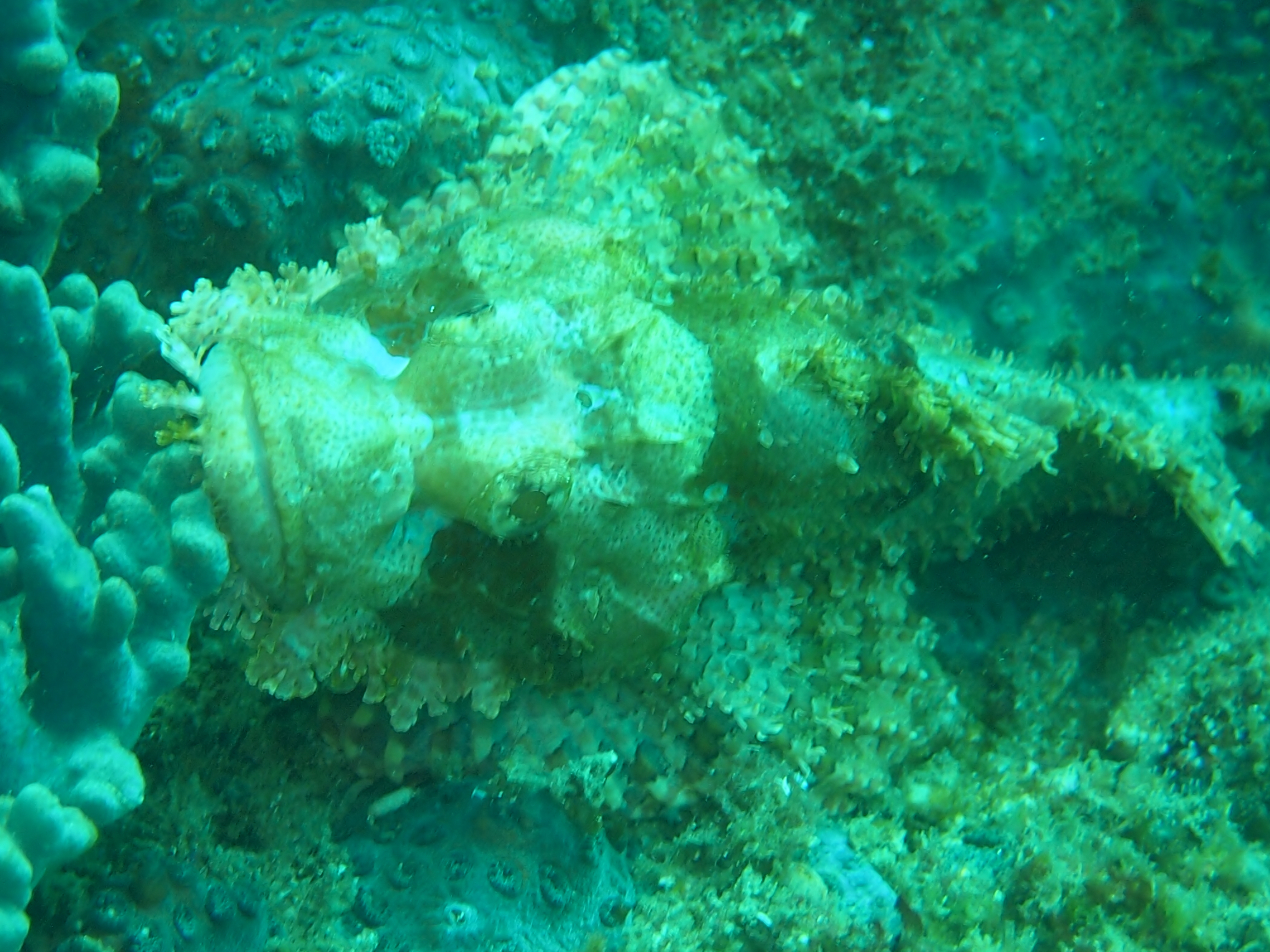 - それからペルカ目オニオコゼ科オニオコゼ属のオニオコゼさんの体色は褐色系が多いのですがこちらも色彩変異は富んでおり特にオレンジ色の珍しい種類もあるようです・・・オニオコゼさんの口は上向きについており体表は他のカサゴ類と同様にいぼ状・房状の突起が発達し皮膚が剥がれているようにも見えます・・・オニオコゼさんの背鰭の棘条に毒腺を備えており背鰭の軟条の形態や鰭膜の切れ込みの形状から近縁のセトオニオコゼさんやヒメオコゼさんと鑑別できます・・・ちなみにセトオニオコゼさんの鰭膜は棘の半分くらいの長さまで切れ込みオニオコゼさんに酷似していますが胸鰭の鰭膜が深く切れ込み体は背鰭基部付近で大きく盛り上がることで区別できます・・・またヒメオコゼさんの胸鰭の遊離軟条は1本のみで涙骨には1棘があり後方を向いていて背鰭軟条の上方に黒色斑がひとつあります・・・オニオコゼさんとオニカサゴさんはよく似ていますが見分ける点があります・・・その一つは鱗があるか?ないか?です・・・オニカサゴさんには鱗がありますがオニオコゼさんには鱗が無くコケみたいなものが体全体にくっついています・・・またオニオコゼさんの頭部はオニカサゴさんと比較すると丸みがあって大きくそのため胴体が小さく見えます・・・つまりオニオコゼさんは頭でっかちなのでオニカサゴさんの頭はオニオコゼさんと比べると小さ目に見えます・・・下の写真はオニオコゼさんかな?