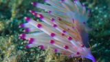 - 砂地に微かに浮き出たような形が見えましたので近づいてみると砂の中から眼だけ出してまるでカエルさんの様にも見えるアカエイさんがいました・・・上手に砂の中に隠れていますがアカエイさんはトビエイ目アカエイ科に属するエイさんで最大幅1.5メートルにもなり体は上から押しつぶされたように平たく座布団のような形をしています・・・座布団の様だと言っても近づくと砂を巻き上げてサッと逃げてしまいますけど・・・左右の胸鰭は緩やかな曲線を描いており吻は尖っていて砂の中に潜っていますが何となくその尖り具合がわかりますかね?