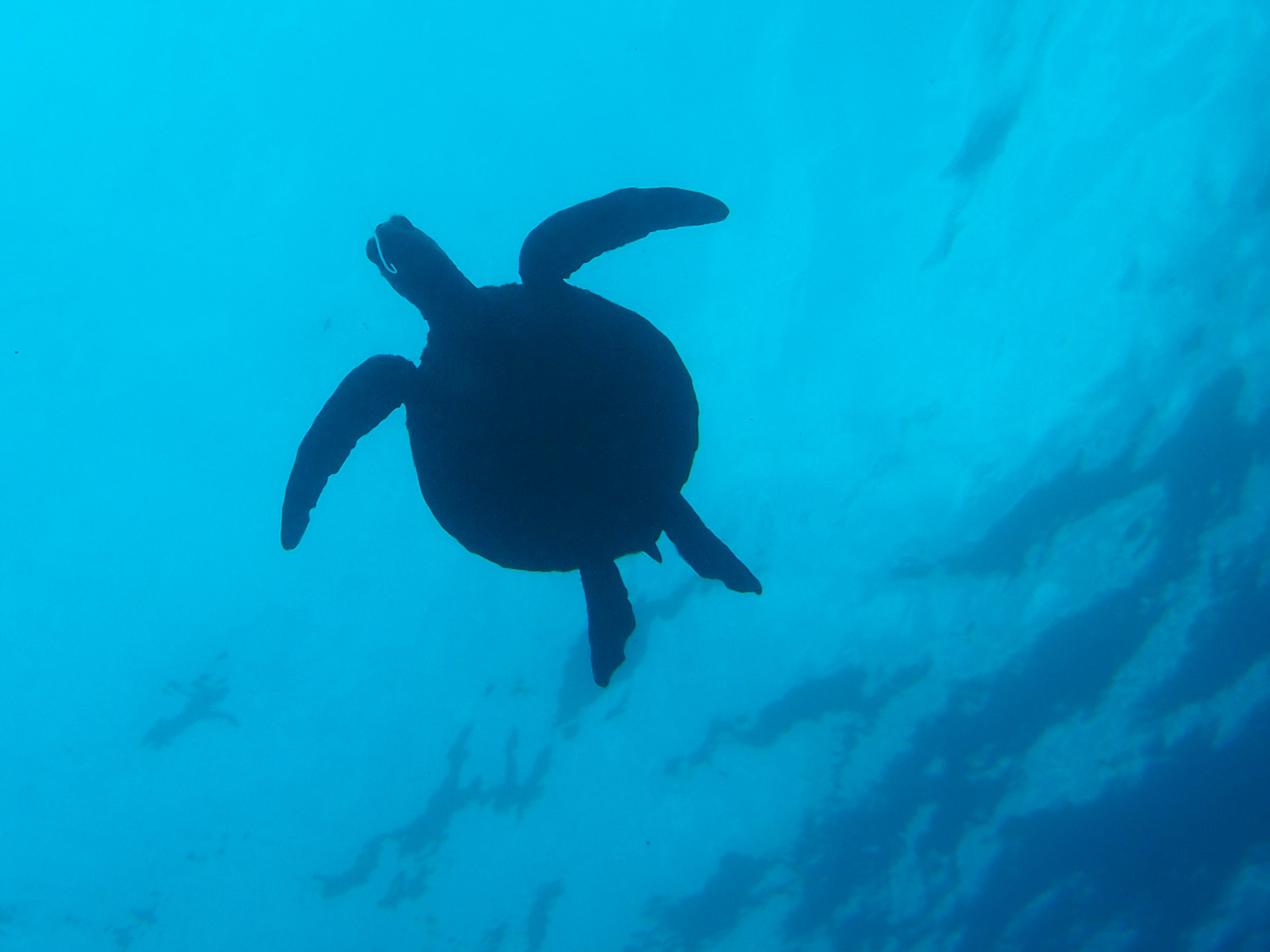- そしてこのボニンブルーの海には昼間は暗い岩陰などにいて実はおとなしいサンドシャークさんなのに口を閉じても鋭い歯がむき出しになっているとても怖い顔のシロワニさんもいます・・・またオレンジ系が一般的なのに全身が黒白のツートンカラーである小笠原特有のクマノミさんもいます・・・それから八丈などでも見られますが黒い友禅柄のユウゼンさんは3~5月にかけてユウゼン玉と呼ばれる大きな群れで見られたり穴にごっそり群れて脚の各節が青紫で白い縞模様がないのが特徴の小笠原にしか生息していないアカイセエビさんの姿も見られます・・・そんな小笠原特有の仲間がたくさん見られるボニンブルーの海でダイビング中にふと上を見上げると可愛らしい影が見えました・・・それはまだ大きくはなく子供だと思いますが甲羅の形からしておそらくウミガメ科最大種であるアオウミガメさんではないでしょうか?・・・アオウミガメさんは頭部は小型で丸みを帯び吻端はあまり突出していませんがなんとものんびりと浮かんでいてこのカメさんを見ていると癒されます・・・でもよく見ると口の所から紐状の様なものが垂れ下がっているようにも見えますが何なのでしょうか?