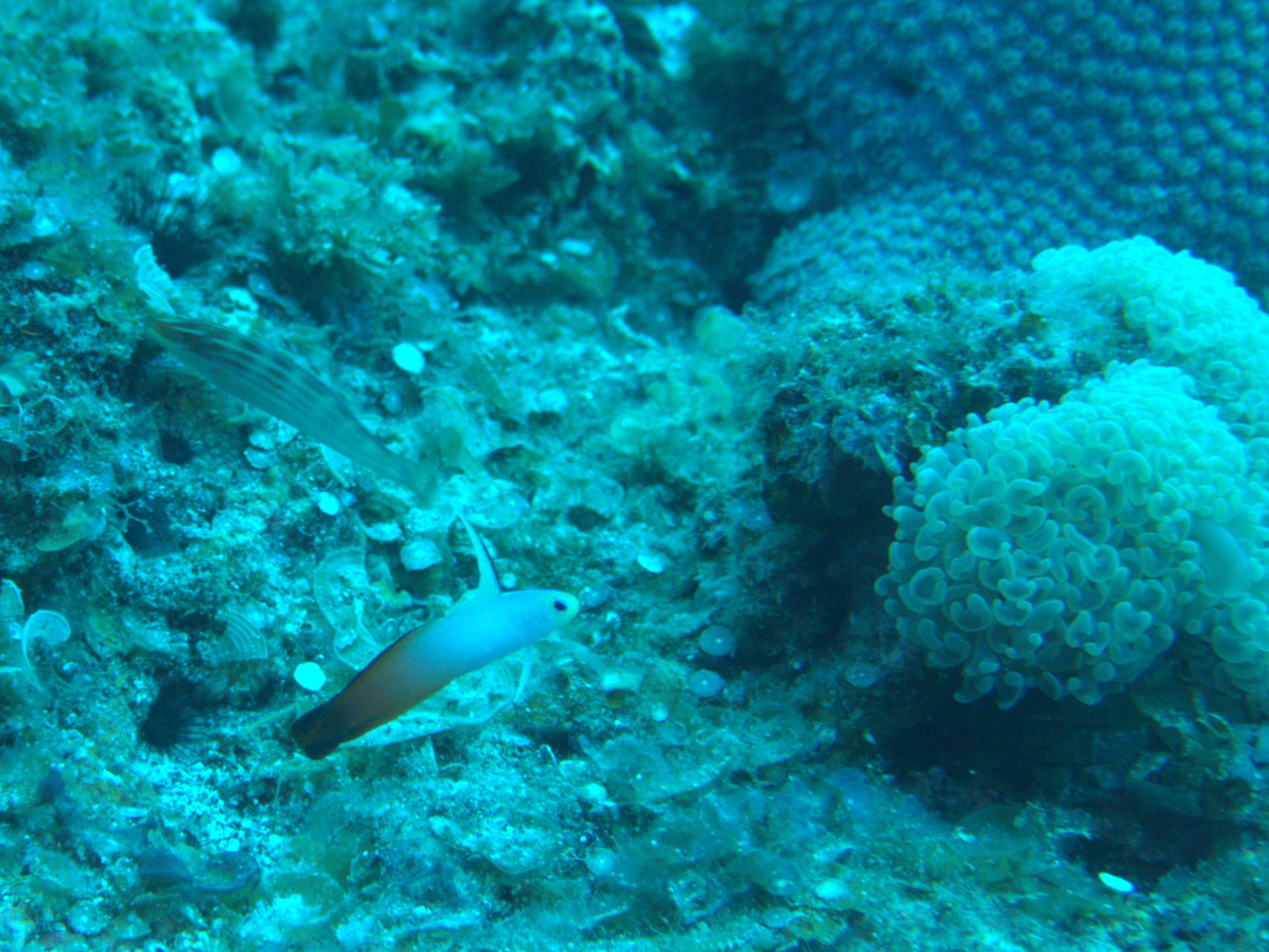 - とても臆病なハゼさんで写真を撮ろうと近づいてもすぐにぴゃっと巣穴に隠れてしまいますのでなかなか近づくことができずいつも困ってしまうスズキ目クロユリハゼ科ハタタテハゼ属のハタタテハゼさんです・・・その為遠くから撮影するのでフラッシュの光が当たらず折角の綺麗な色が出ていませんがいろいろな所に出没する小型のハゼさんです・・・今回もいろんなところで結構見かけペアでピョコピョコしているので何とかフラッシュを当てたいとそーっと近づいて見るのですが直ぐに気づかれて隠れられてしまう私にとっては撮影難度の高いハタタテハゼさんなのです・・・ハタタテハゼさんは大きくても全長7cm程度で白~黄色の頭には薄紫のライン模様があって尾鰭に近くなるほど濃くなる赤いグラデーションの体色をしておりとてもポップで可愛いハゼさんなのです。