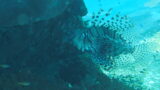 - テナガエビ科ホンカクレエビ属に属するコロールアネモネシュリンプさんは白い帽子をかぶって赤い服を着たまるでサンタクロースの様なかわいい色をしたエビさんです・・・砂が舞い上げ汚くなって申し訳ない事をしてしまいましたがイソギンチャクさんの間から「見つかってしまった!せっかく上手に隠れていたのに!お願いだから砂かけないでよ!」 と叫んでいるコロールアネモネシュリンプさんです・・・コロールアネモネシュリンプさんの体長は約1.5cm程度と小さくわかりづらいのですがよく見ると薄紫色の透明の長い手足に各関節部は青紫色の斑点があります・・・結構お洒落を気にしているコロールアネモネシュリンプさんですが生息水深は10m以深でサンゴ礁の斜面に生息するパラオクサビライシさんなどに共生しています。