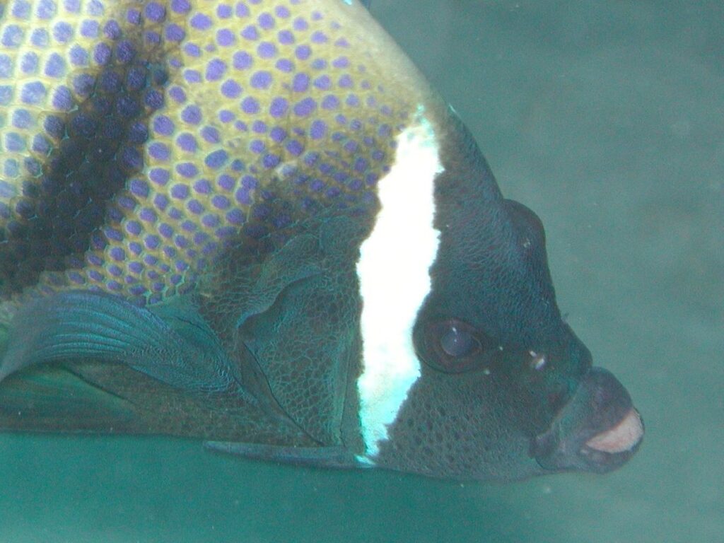 • ちょっと太々しい表情のこのお魚さんはスズキ目キンチャクダイ科サザナミヤッコ属のロクセンヤッコさんではないでしょうか?・・・「なんだよう!何か文句でもあるのかよう!」とでも言っているように見えるこのロクセンヤッコさんの頭部は黒色で後ろに白いラインが1本入っています・・・この写真では全体が見えないのでよくわかりませんがロクセンヤッコさんの体側には黒色横帯が5本あり体側・背鰭および臀鰭の後方そして尾鰭には青い斑点が散らばり胸鰭と腹鰭は黒くなっています・・・ロクセンヤッコさんのおちびさんはアデヤッコさんのおちびさんによく似ていますがアデヤッコさんのおちびさんは濃紺の体に白い横縞があり背鰭・臀鰭の縁が丸くロクセンヤッコさんのおちびさんは背鰭および臀鰭軟条部外縁がわずかに尖ることから区別は可能です・・・ちなみにアデヤッコさんはBlueface Angelfishの名で人気の大型ヤッコさんで派手さと威厳を両立した存在感があります・・・アデヤッコさんは青い顔と目の周りの鮮やかな黄色が最大の特徴で体側は黄色と青の網目模様で背鰭後方に黒と青のスポットがあります・・・ロクセンヤッコさんは大型種で全長50cm近くになりますがペア行動が多く臆病な性格で警戒心が強いためダイバーが近づくのが難しいお魚さんと言われています。