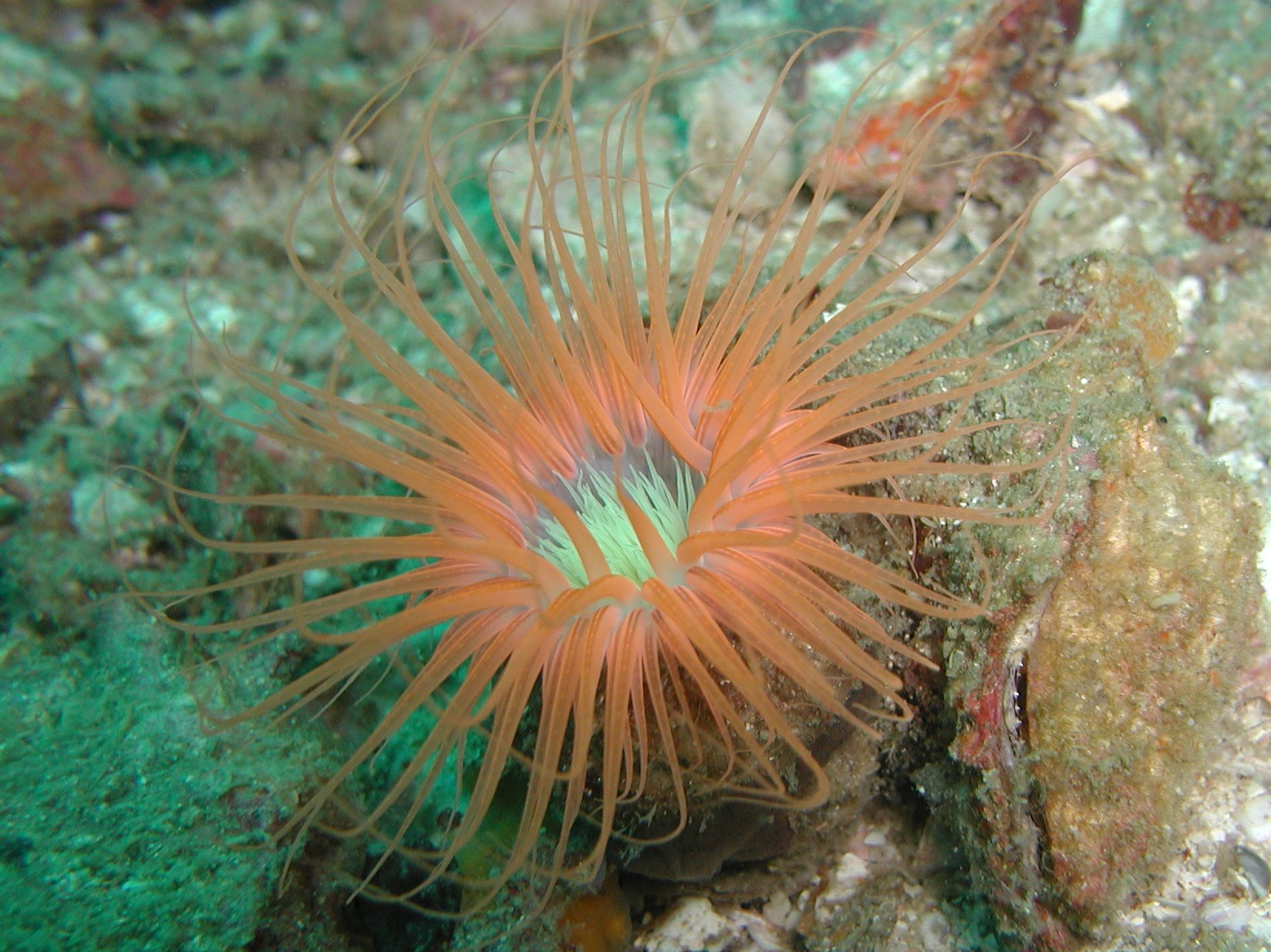 - オレンジ色の綺麗な花の様に揺らいでいるのはイソギンチャクさんですがイソギンチャクさんってどんな生き物なのでしょうか?・・・イソギンチャクさんは岩の上などに定着して生活する動物で体は基本的には円筒形になっていて上の面を口盤とよびその中央には口があります・・・イソギンチャクさんの口盤の周辺には写真の様に多数の触手が並んでいてユラユラユラユラしています・・・イソギンチャクさんの触手は普通円錐形になっていますが先端部が膨らんだものや多数の枝をもつ場合もあります・・・イソギンチャクさんの下面は足盤とよばれここで粘着性物質を分泌して岩などに吸着していますがイソギンチャクさんはこの足盤を使って時速数cm程度の速度で移動することができるのです・・・イソギンチャクさんが移動しているというのは意外ですが確かに子供の頃イソギンチャクさんが岩からポロッと取れた記憶があります。