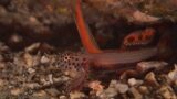 - モンハナシャコさんは他のハナシャコ科のシャコさんと同様に昼行性で浅い海で暮らしていますがサンゴの破片に覆われた柔らかい堆積物に一生懸命巣穴を掘って暮らしています・・・モンハナシャコさんの巣穴は単調なU字状坑道になっていますが細かいサンゴ礁の破片で坑道の内壁を丁寧に補強する様な神経質で働き者のモンハナシャコさんなのです・・・クラッシャーハナさんと言えども天敵に襲われない様に住むところにはやはり気を使っているのです・・・そんなモンハナシャコさんですが複眼はピンク色で先節と眼柄は青色になっており触角柄部と顎脚の前部に白い模様が綺麗に散在しています・・・またモンハナシャコさんの第2触角鱗片は黄色く先端は黒くなっていて縁辺部全体に剛毛が生えていますがその剛毛は赤くなっています。