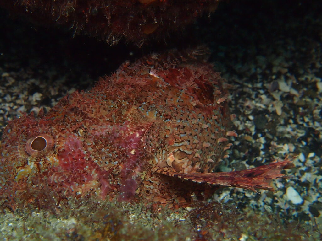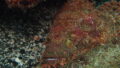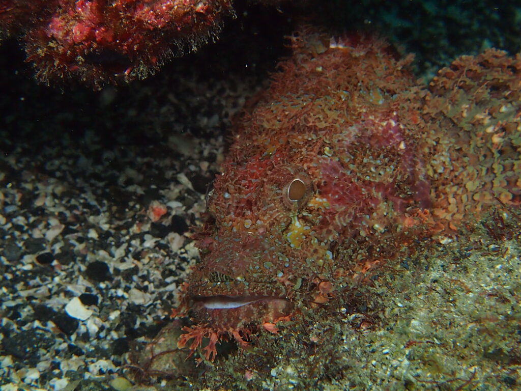 - 岩肌によく似た色彩をして静かに鎮座しているのはスズキ目フサカサゴ科オニカサゴ属のオニカサゴさんではないでしょうか?・・・オニカサゴさん自身も見事に擬態しているつもりの様ですが砂利の上ではちょっと目立っているように思えます・・・オニカサゴさんの体色は赤っぽいものが多いのですが赤褐色~茶褐色で変異は大きく胸部と腹部以外の躯幹部と各鰭に黒色斑点が散在し最長背鰭棘は第4・5棘で臀鰭第2棘は第3棘よりもやや長いことなどが特徴ですがよくわからないですね・・・体には突起や棘が無数存在し口は大きく口角は眼の下くらいまであり口蓋歯を持たないオニカサゴさんの頭部は強く圧縮されており眼窩下の棘は3本以上あり顎下には皮弁があるのも特徴です・・・オニカサゴさんは沿岸の岩礁から水深200m以浅の珊瑚礁域およびその周辺の砂地に棲んでいて甲殻類や小魚さんを主に捕食する肉食性のお魚さんで海底で潜んで待ち伏せしています。