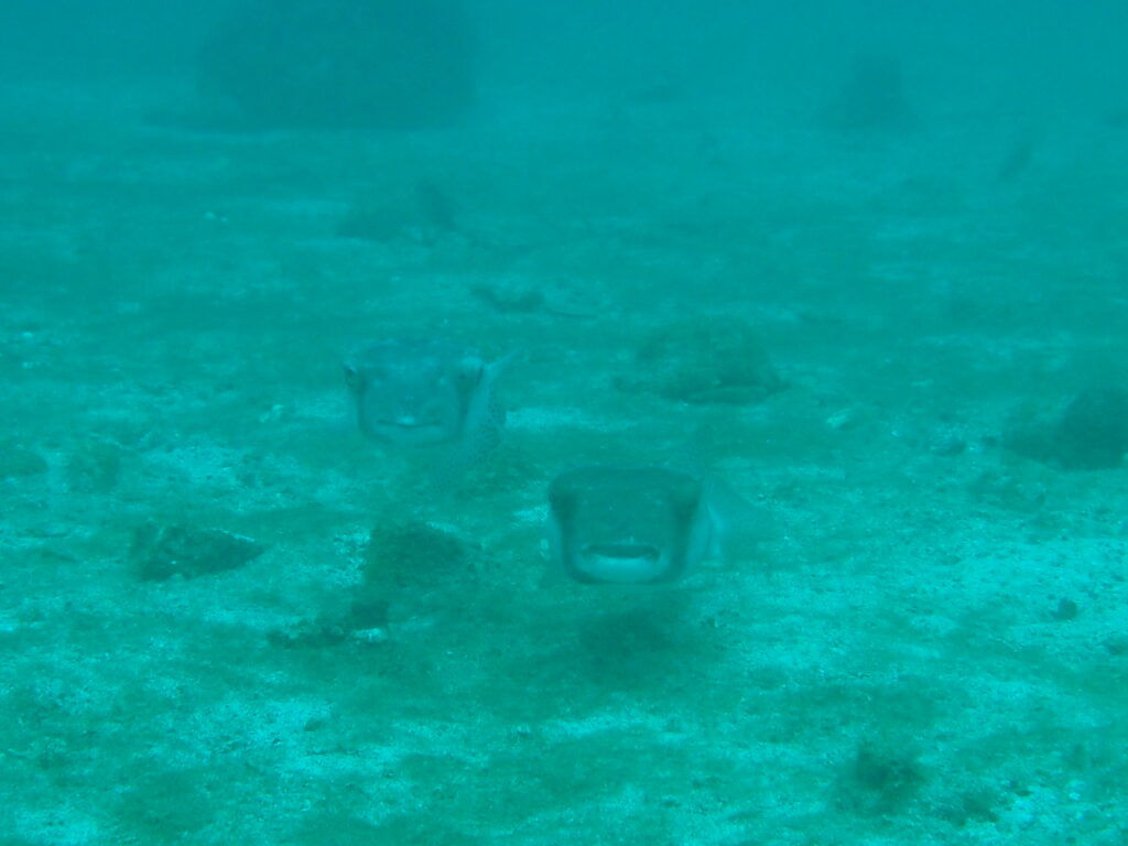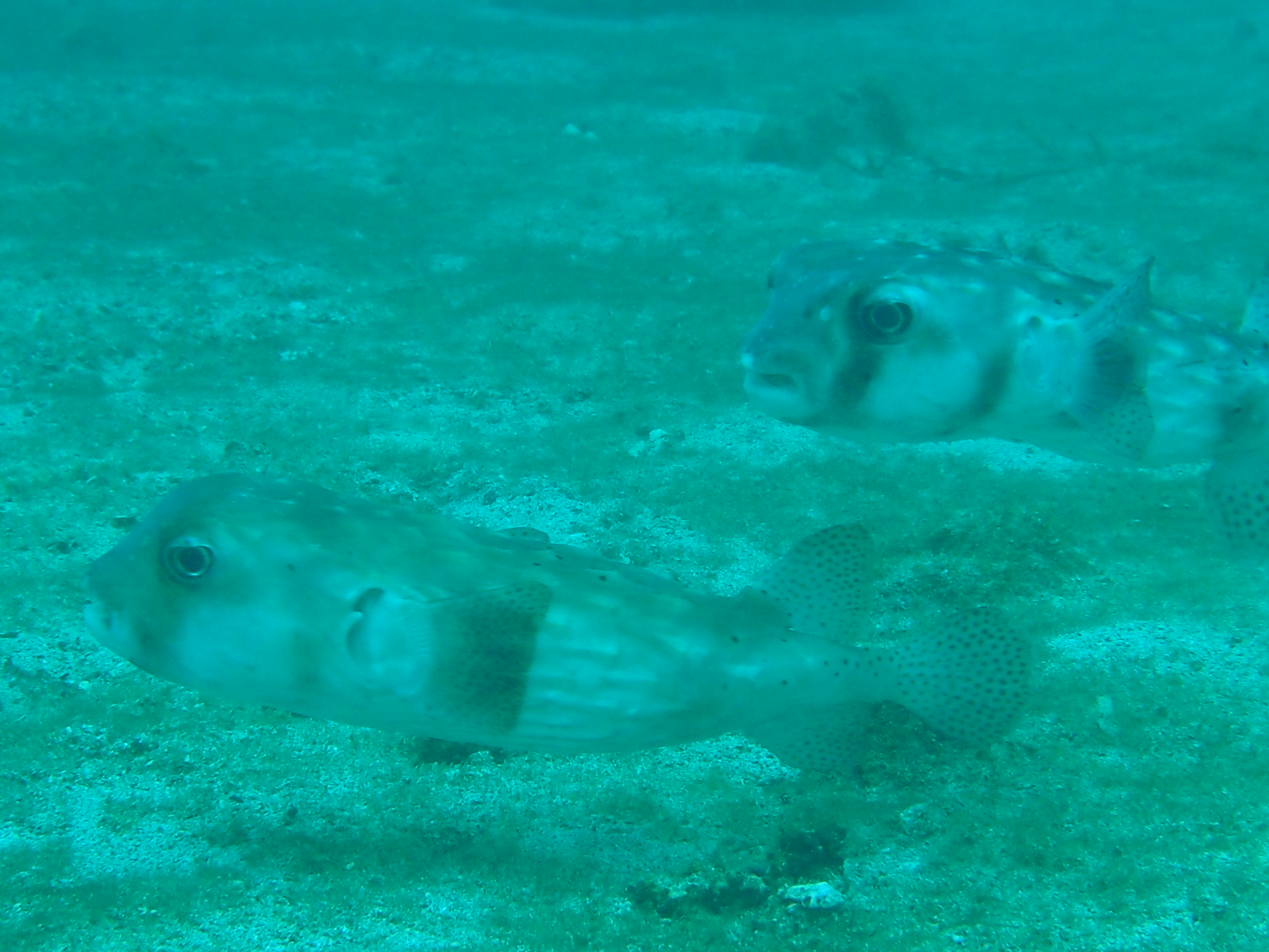 - こちらを向いて可愛い顔で見つめているのはフグ目ハリセンボン科ハリセンボン属のハリセンボンさんではないでしょうか?・・・2匹のハリセンボンさんのあどけない顔が何とも言えないのですが体表には多数の棘があり身体を膨らませるとイガグリのようになるフグさんです・・・ハリセンボンさんは別名トゲフグさんとかハリフグさんとか呼ばれ沖縄ではアバサーさんと呼ばれています・・・ハリセンボン科のお魚さんは広く世界に分布し6属20種類ほどが知られていて全長15cmほどのものから70cmを超えるものまでいます・・・ハリセンボン科のお魚さんは腹鰭がなく顎の歯が癒合していて皮膚が厚く敵に襲われると水や空気を吸い込んで体を大きく膨らませ鱗が変化したたくさんの鋭い棘で身を守ります・・・フグ科の歯は上下2つずつ合計4つになっているのに対しハリセンボン科の歯は上下1つずつ合計2つである事で区別できますが写真ではちょっとわかりづらいですね・・・浅い海の岩礁や砂底に生息し他のフグ目のお魚さんと同様に胸鰭や尻鰭や背鰭をパタパタと羽ばたかせながらゆっくりと泳ぎ食性は肉食性で貝類や甲殻類やウニさんなどさまざまな底生生物を頑丈な歯でバリバリバリと捕食します。