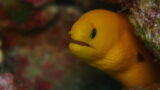 - 遠くから眺めていると砂地に微かに浮き出たような形が見えましたので近づいてみたところ砂の中から眼だけ出してまるでカエルさんの様にも見えるアカエイさんが潜っていました・・・上手に砂の中に隠れていますがアカエイさんはトビエイ目アカエイ科アカエイ属に属するエイさんで最大幅1.5メートルにもなり体は上から押しつぶされたように平たく座布団のような形をしています・・・座布団の様だと言って近づくと砂を巻き上げてサッと翻って逃げてしまいます・・・アカエイさんは左右の胸鰭は緩やかな曲線を描いており吻は尖っていて砂の中に潜っていますが何となく砂の盛り上がりからその吻の尖り具合がわかりますかね?・・・アカエイさんの背面は赤褐色~灰褐色で腹面は白く鰭や尾など辺縁部が黄色~橙色になる点で近縁種と区別ができますが砂の中に潜っているので判別はできませんね。