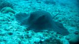 - あれ?下の写真のアカエイさんは砂を塗した程度でだいぶ身体が露出していますがどうしたのでしょうか?・・・アカエイさんは自分では上手に潜っているつもりなのでしょうか?それともこのアカエイさんの性格が若干雑なのでしょうか?危険を感じて臨戦態勢なのでしょうか?よくわかりませんが砂の中から出た眼は眼をつむって眠っているようです・・・それにしてもこんなに砂まみれになって目の中に砂が入らないのでしょうか?・・・人間だったら目の中に砂が入ってたまらないと思うのですが流石アカエイさんですね邪魔をしないようにそっと撮影いたしましょう・・・これだけ砂の中から出ているとアカエイさんの特徴である吻が尖っているのが下の写真で確かにわかります・・・アカエイさんの体表はほとんど滑らかなのですが背中の正中線付近には小さな棘が並んでいて尾にも短い棘が列を成して並んでいます。