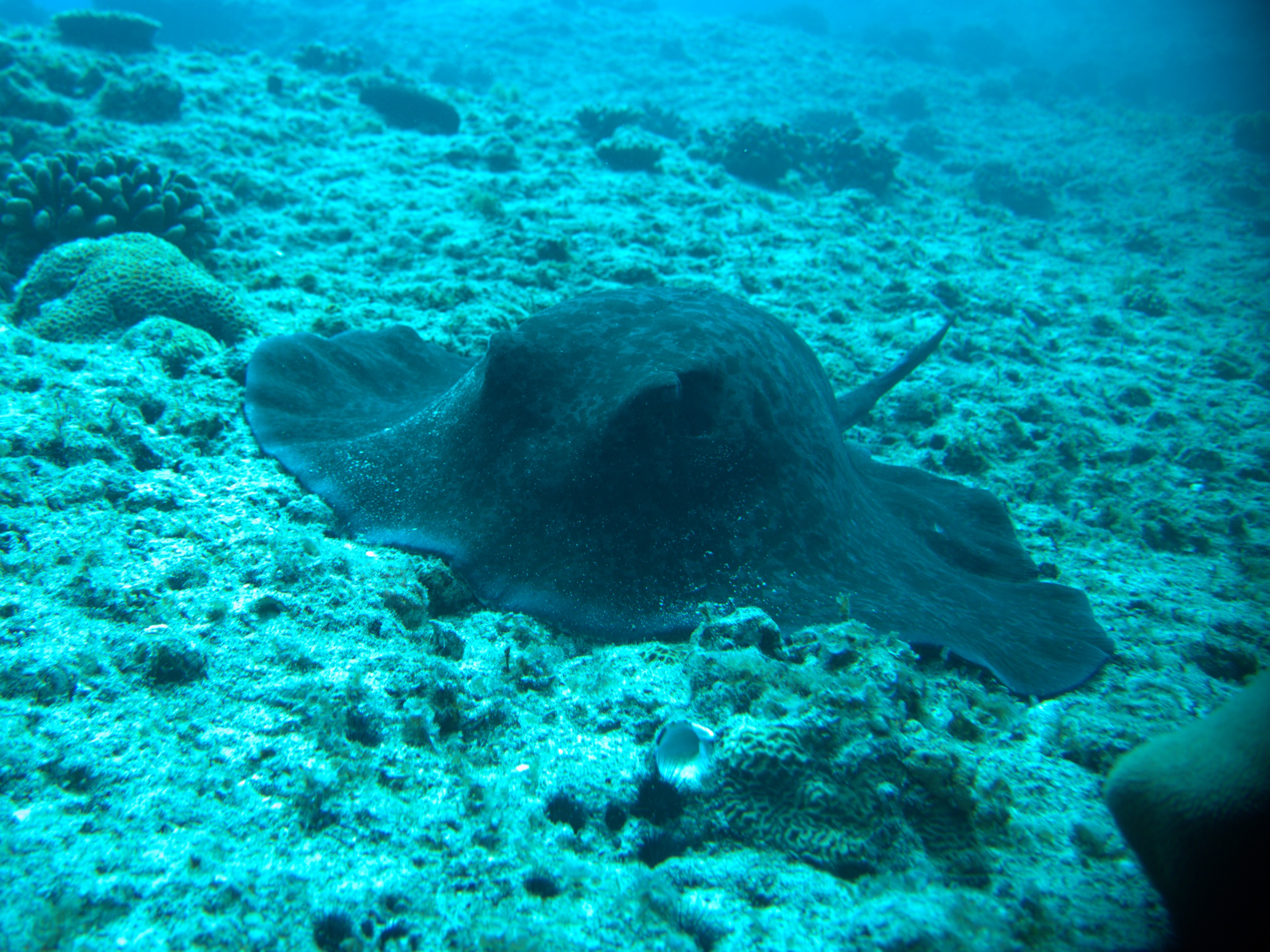 - 下の写真はエキジットまじかだったので水深を下げずに遠くから撮影したのでぼやけてしまいましたが海の底の砂地でのんびりと休んでいる背中の斑が目立つマダラエイさんです・・・でもマダラエイさんの尾は比較的短く体盤幅を超えないのですがこの写真のマダラエイさんの尾はちょっと短かすぎませんか?・・・このマダラエイさんはもしかして天敵であるサメさんやイルカさんに尾の棘による威嚇行為に失敗してしまったのかそれとも自分の尾を犠牲にしてでも修羅場を生き抜こうと頑張った結果なのでしょうか?・・・そんな弱忍強食の厳しい世界からなんとか生還して一時休憩しているだけなのでしょうか?・・・何はともあれ尾以外は無事のようですので何よりですがマダラエイさん邪魔しないのでゆっくりお休みください。