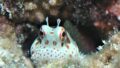 - 上の写真のニジギンポさんはクリクリした可愛い眼で行儀よく腹鰭をきれいに揃えて慎ましやかに立っていますしが確かに大きな歯があります・・・噛まれると痛そうですがニジギンポさんの表情をよく見てみると眼付が鋭くて「俺の縄張りを荒らす奴は咬みつくぞ!」とでも言いたげです・・・下の写真のニジギンポさんは口を半開きにして「ん?誰か呼んだ?お話でもする?」というような愛嬌のある可愛い表情をしていますが気を付けないと咬みつかれてしまいます・・・怖い!怖い!・・・それからニジギンポさんには項部に皮弁はありませんがニジギンポさんによく似た内湾や藻場に暮らしているイヌギンポさんの項部には皮弁があるのでそこで区別できます・・・ちなみに項部とは首の後ろの部分すなわちうなじを指す言葉で解剖学的には後頸部とも呼ばれています・・・その他にイヌギンポさんは鰓蓋にも尾鰭基底にも顕著な暗色斑はなく下顎の皮弁は分岐しておらず背鰭第一棘は第二棘より短く背鰭前端は高くなっていません。