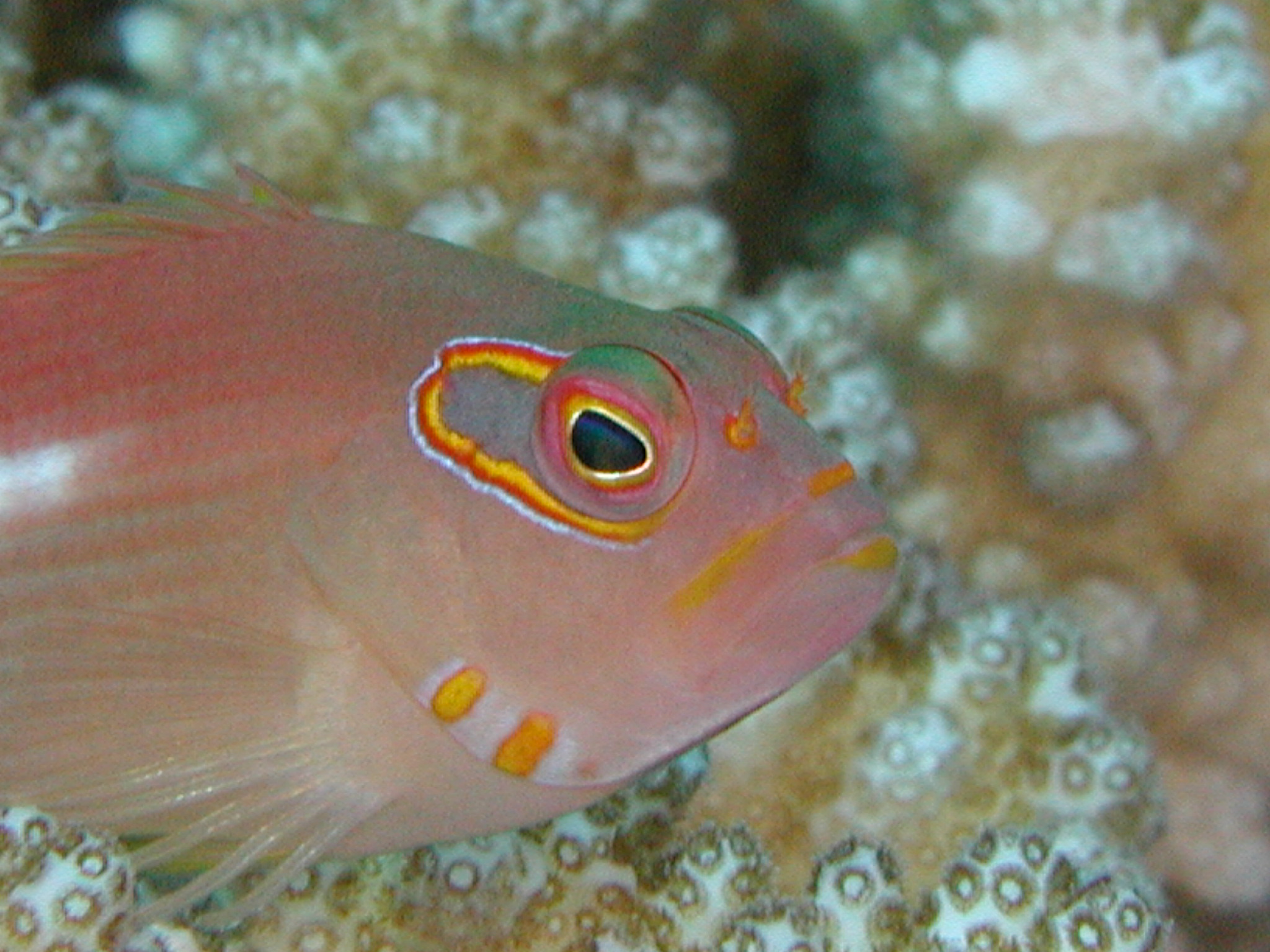 - 浅い海の潮通しが良くてサンゴが発達したサンゴの縁やサンゴの斜面などにちょこんと居座っているメガネゴンベさんは遠くから見ていると胸鰭で身体を支え堂々としているのですがダイバーが近づくとさっとサンゴの隙間などに隠れてしまう警戒心が強く臆病な性格です・・・メガネゴンベさんの和名の由来となっている眼の後方の黄色と赤色と淡青色の三色のリング状の斑紋はグラデーションがとても綺麗なのですがこの特徴から一目で「あ!メガネゴンベさんだ」とわかります・・・メガネゴンベさんの仲間は枝サンゴなどの上から全体を見下ろすように俯瞰していることが多くこの様子が鷹が上空から獲物を探す姿に似ているため英名では「hawkfish」と呼ぶそうですがゴンベさんが鷹だなんてかっこ良すぎませんかね?・・・メガネゴンベさんは結構小さいのに縄張り意識が強くびっくりするとあっと言う間にいなくなりますがすぐにまた元いた位置に戻ってきて「ここは俺の縄張りだ」と言わんばかりにあたりをキョロキョロします。