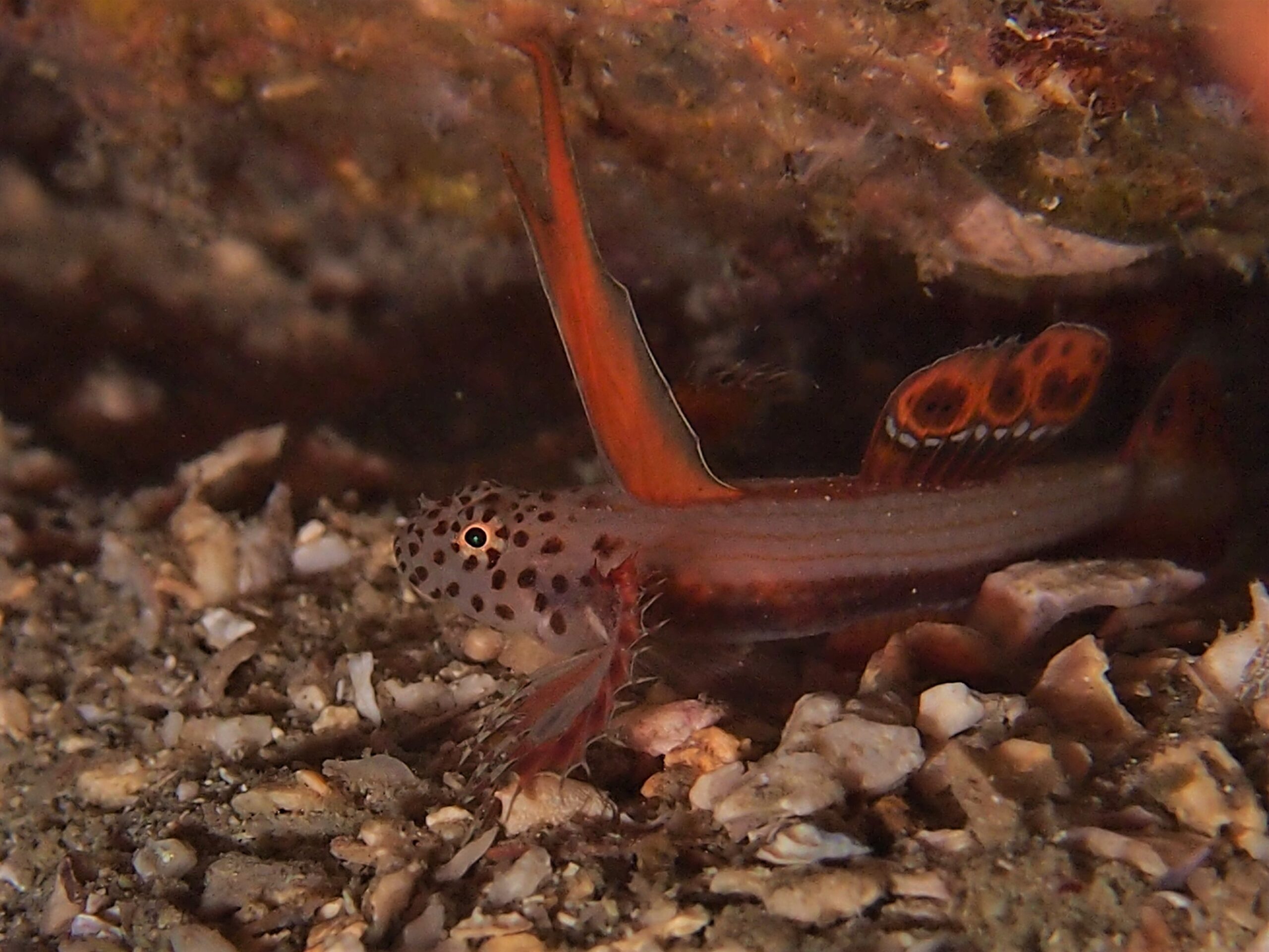 • 岩陰から姿を現してくれたのは鮮やかな鰭が目立つスズキ目ハゼ科ホムラハゼ属のホムラハゼさんではないでしょうか?・・・ホムラハゼさんはご多分に漏れずとても臆病なハゼさんなのでいつも岩穴の中に隠れてなかなかお目にかかれないのです・・・でも今日はホムラハゼさんの機嫌が良かったのか運よく姿を見ることができました・・・しかも日頃の私の行いが良かったのかどうかわかりませんがタイミングよくホムラハゼさんは鰭を大きく広げてくれたのです・・・ホムラハゼさんは燃えるような鮮やかな鰭を広げて洞穴からピコピコピコと動きながら姿を現してくれたのです・・・「せっかくだから僕の自慢の鰭を見せてあげるよ!」という表情で撮影に協力してくれたホムラハゼさんありがとうございます。