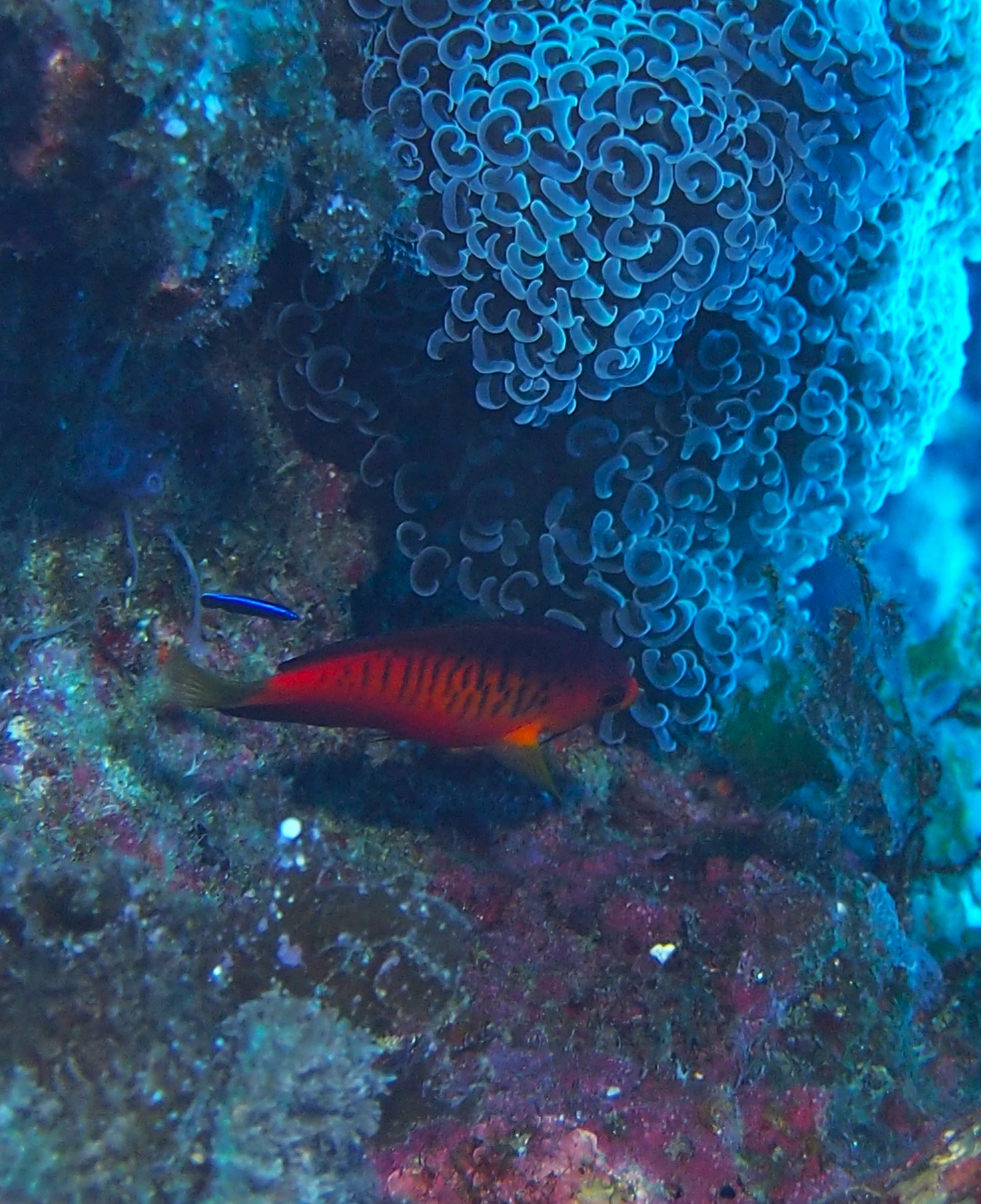- またダイダイヤッコさんの性格は幼魚の頃は比較的おとなしいのですが成長するにつれて攻撃的な性格になっていき特にオスの成魚は非常に気が荒いそうです・・・ちなみにダイダイヤッコさんのオスは成熟すると背鰭と尻鰭の先端が尖り鰓蓋後方が青くなることが多いようです・・・そんなに気が荒いダイダイヤッコさんならもう少し近づいてくれれば撮影しやすいのにと思うのですが何故かダイダイヤッコさんは直ぐに逃げてしまうのです・・・そして遠くから「近づいて来るなよ!」という顔でこちらをジッと伺っていて臆病なのか気が強いのかよくわかりません・・・上の写真のダイダイヤッコさんはホンソメワケベラさんにクリーニングしてもらおうと待機しているのでしょうか?・・・ホンソメワケベラさんもヤッコさんのどこかに寄生虫がいないかなあと探しているようです。