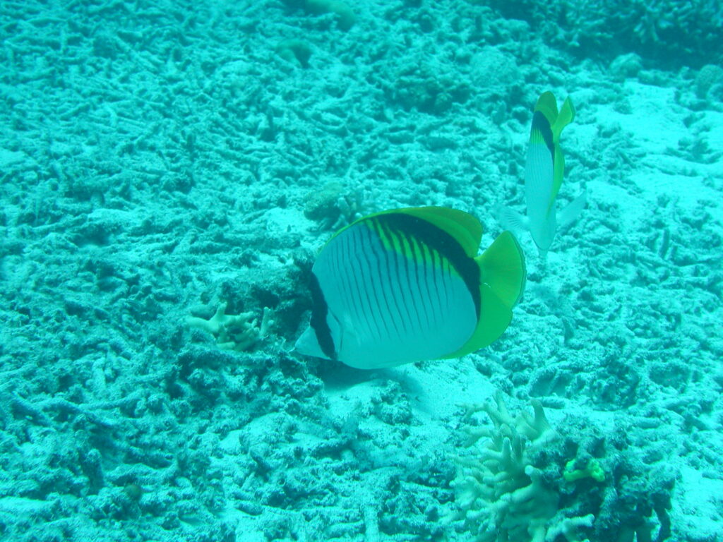 - 可愛い花が咲いているような綺麗な珊瑚の隙間に隠れて「怖いからこっちに来ないでよ~!!」とびびって逃げようとしているおちびさんはスズキ目チョウチョウウオ科チョウチョウウオ属のニセフウライチョウチョウウオさんではないでしょうか?・・・ニセフウライチョウチョウウオさんはチョウチョウウオさんの仲間では大型の種類なのですがサンゴの大きさと比べてもお分かりいただけると思いますがこのニセフウライチョウチョウウオさんはおちびさんなのでやはり可愛いですね・・・ニセフウライチョウチョウウオさんの特徴は体側に多数の細い黒色横帯がありまた頭部に眼を通る黒色帯がありますがこの黒色帯は二つに分離していません・・・その他にニセフウライチョウチョウウオさんの背鰭・尾鰭・臀鰭は一様に黄色をしており成魚になると尾鰭には濃黄色の横帯がでてきます。