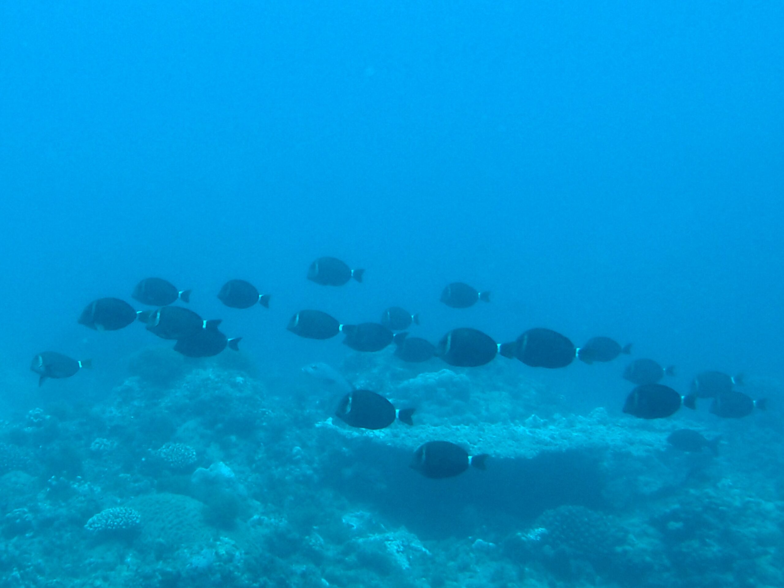 - ちょっとボケた写真になってしまいましたがこちらの群れはそんなに大きくないのですが妙に急いでいるスジクロハギさん達です・・・頭とお尻に白いラインが映える黒い軍団ですがボニンブルーの海を一糸乱れぬ勢いで通り過ぎようとしています・・・もしかしたら大物に追われてるのかと思って後方を見てみましたがそんな姿は見えずいったいどうしてそんなに急いでいるのでしょうか?・・・でもスジクロハギさんの軍団の奥をよ~く見ると遠くにお魚さんの群れがいる事がわかりますかね?・・・右手前にイスズミさんが居ますのでおそらくイスズミさんの群れではないかと思うのですが残念ながらはっきり写っていません・・・まあイスズミさんがスジクロハギさんを襲うという事は無いと思いますが?・・・イズスミさんと言えば釣りあげると糞をまき散らす習性があり「うんこたれ」とか「ババタレ」とも呼ばれる可哀そうなお魚さんです・・・もしかしたらイズスミさんが糞を巻き散らすことをスジクロハギさんが嫌って急いでいるのでしょうか?