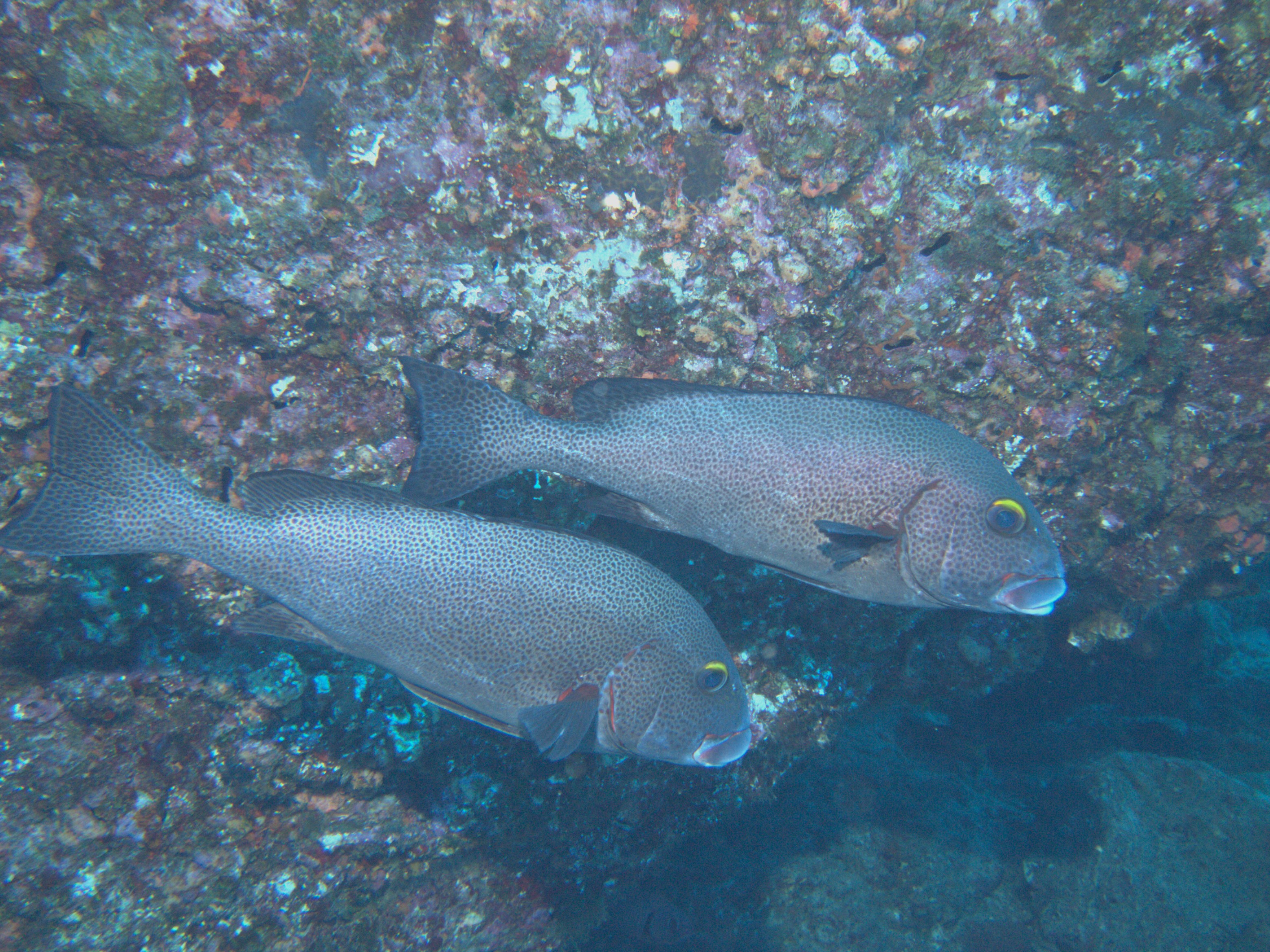 - 岩礁の間に群れて隠れているのはエビさんやカニさんや小魚さんなどを食べて生活している体長50cm程度のスズキ目イサキ科コショウダイ属に属するアジアコショウダイさん達です・・・食事中では無いようですが変な奴が近づいてきたぞと一斉に警戒しているアジアコショウダイさん達です・・・比較的スマートな体形で体色は茶色がかった明るい灰色をしており唇が分厚く口の周りが赤色で暗色の斑紋が密にあり背鰭に太い棘があります・・・ちなみにアジアコショウダイさんのおちびさんの頃は白色と黒色の帯が見られ成長するに従って黒点へと変化していきます・・・アジアコショウダイさんの密な黒色斑紋が胡椒のように見え鯛のように美味しいということでコショウダイさんと呼ばれるようになりアジアに多く分布していることからアジアコショウダイさんと命名されたそうです・・・わかり易い名前の付け方です。