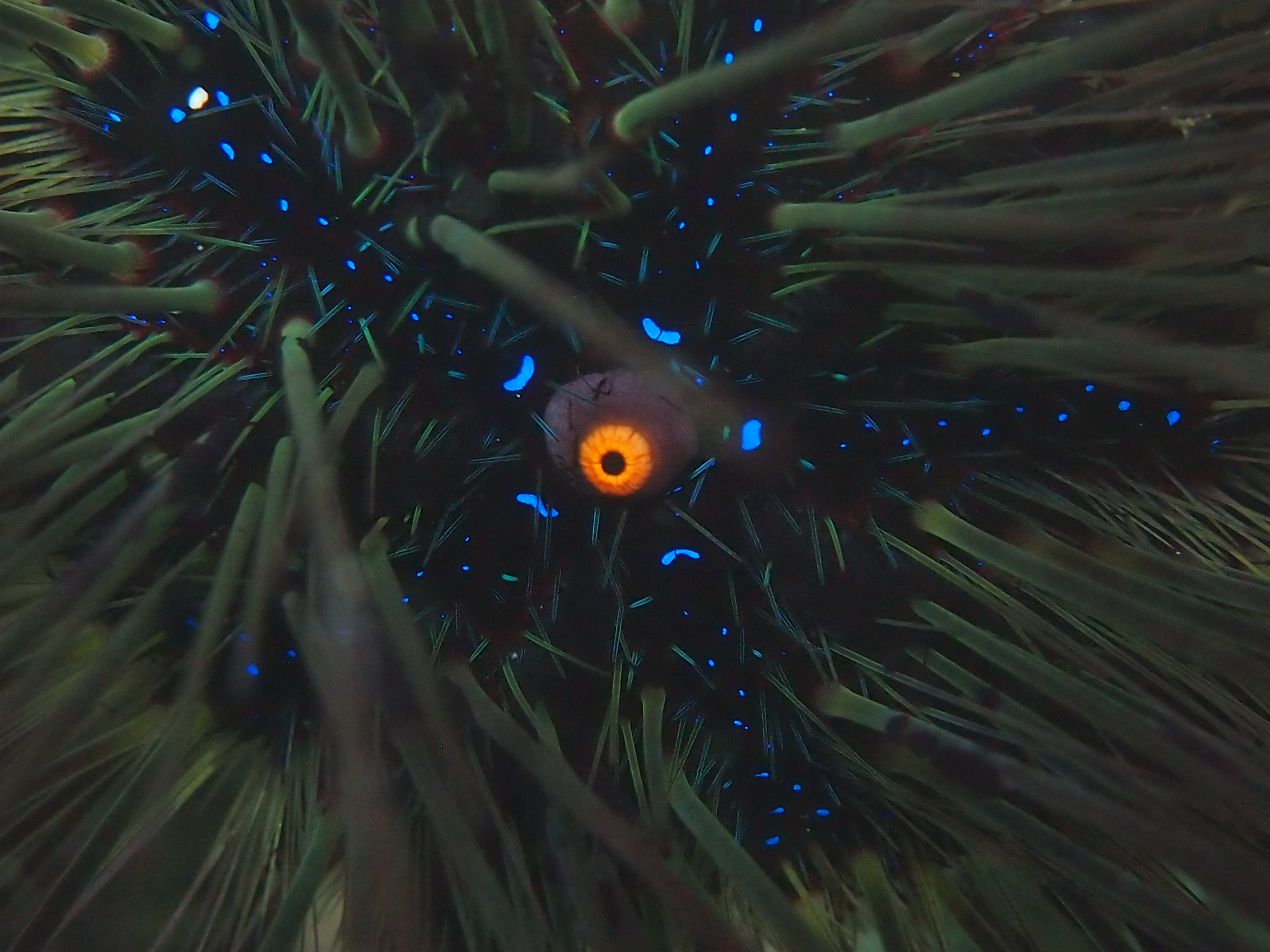 - 海に潜ると黒紫色で凄いトゲトゲのガンガゼ目ガンガゼ科ガンガゼ属のガンガゼさんがごちゃっと集団で固まっている所をよく見かけます・・・ガンガゼさんの棘は長いものは30cmに達しガンガゼさん本体に比べて著しく長いのですが棘が全て長いという訳ではなく上向きの棘が長く体の下側の棘は短くなっているのです・・・こんな凄いトゲトゲのガンガゼさんですがひっくり返されると下側の棘は短く殻は薄くて脆いので容易に攻撃されてしまうのです・・・だからガンガゼさん達は互いに寄り合い棘を交差させてひっくり返されないように集団になるのです・・・またガンガゼさんは殻の表面に光を感じる眼点を持ち自分の体の上に何らかの陰がかかると棘を振り動かす防衛反応も行うそうです・・・確かに私が近づくと集団で針を振り動かしていましたがそういう事だったんですね。