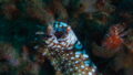 • サンゴ礁の岩陰など暗いところには夜行性で暗いところが好きなお魚さんがよくいるのでそんな場所を覗いてみると居ました居ました・・・このお魚さんはちょっと古代魚の様な印象を与えるキンメダイ目イットウダイ科アカマツカサ属のツマグロマツカサさんではないでしょうか?・・・ツマグロマツカサさんは度胸があるのかどうかわかりませんが比較的のんびりと岩陰でホバリングをしています・・・その為私としては比較的撮影しやすいお魚さんなのですが体の色はやや暗い赤色で鱗が光に当たると反射し輝いて見える面白いお魚さんです・・・ツマグロマツカサさんは背鰭棘の上方と軟条部や臀鰭軟条部や尾鰭後方は暗色になっており他のマツカサさんとは鰭の先端が黒いところで区別できます。